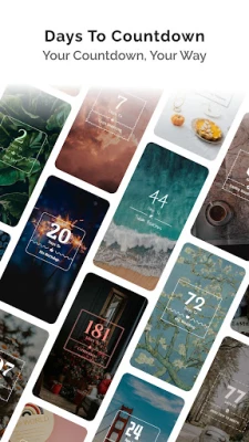 Days To Countdown eleva a personalização a um novo patamar, permitindo que você infunda sua individualidade em cada lembrete. Escolha entre uma vasta gama de planos de fundo deslumbrantes ou use suas próprias fotos para tornar cada ocasião verdadeiramente única. Com opções para personalizar cores, molduras e fontes, cada contagem se torna uma obra de arte pessoal. Além disso, os widgets de tela inicial oferecem flexibilidade e estilo: desde o design icônico 2x2 para um destaque audacioso, o discreto 1x1 para minimalistas, o elegante 2x1 para otimizar o espaço horizontal, até o prático widget de lista 4x2 que apresenta todos os seus eventos futuros em um formato claro e fácil de ler.